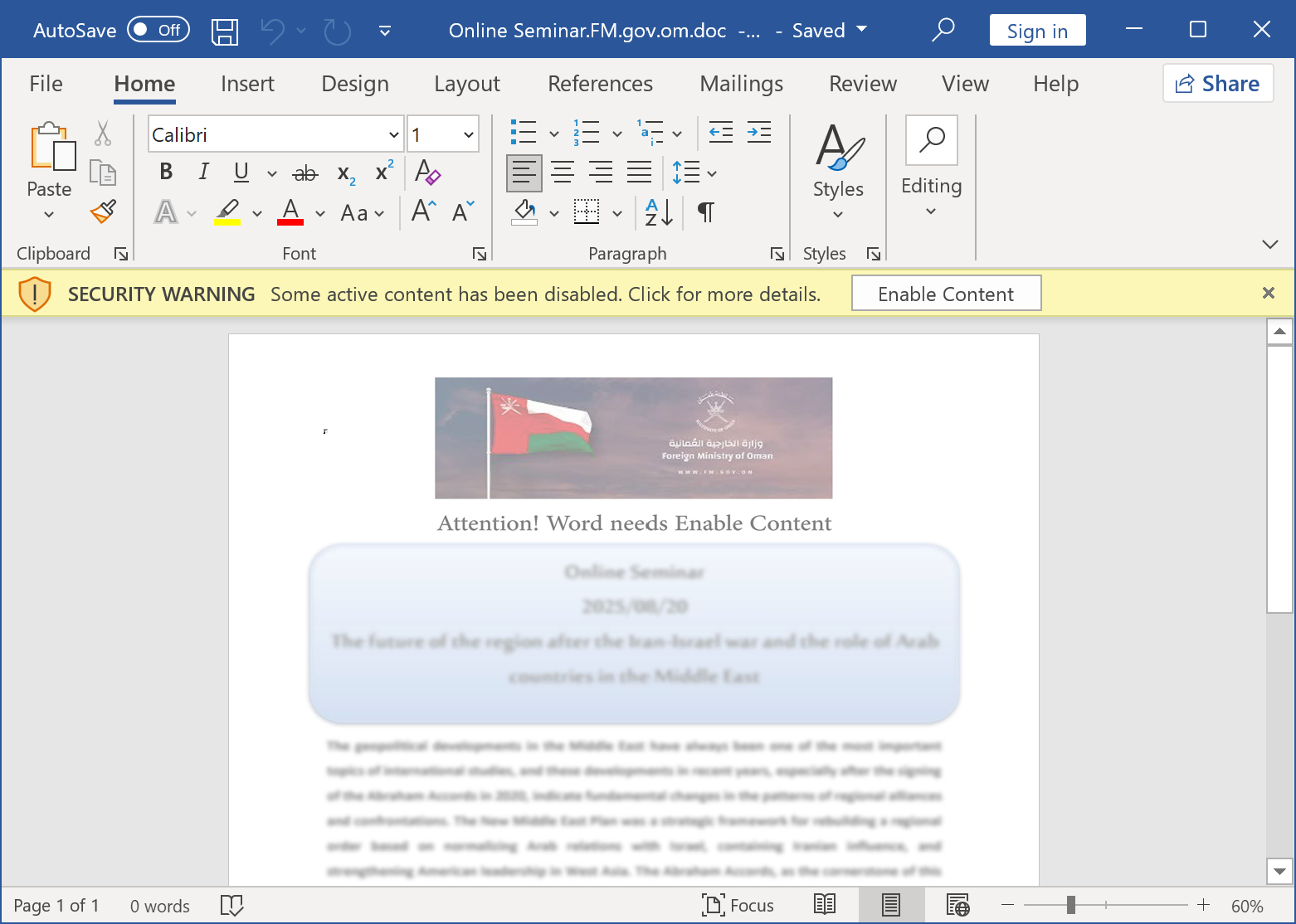 Cybersecurity authorities in multiple countries, including the United States and the United Kingdom, have highlighted that Middle East-based threat actors continued to rely on document-based spear-phishing as an initial access method.