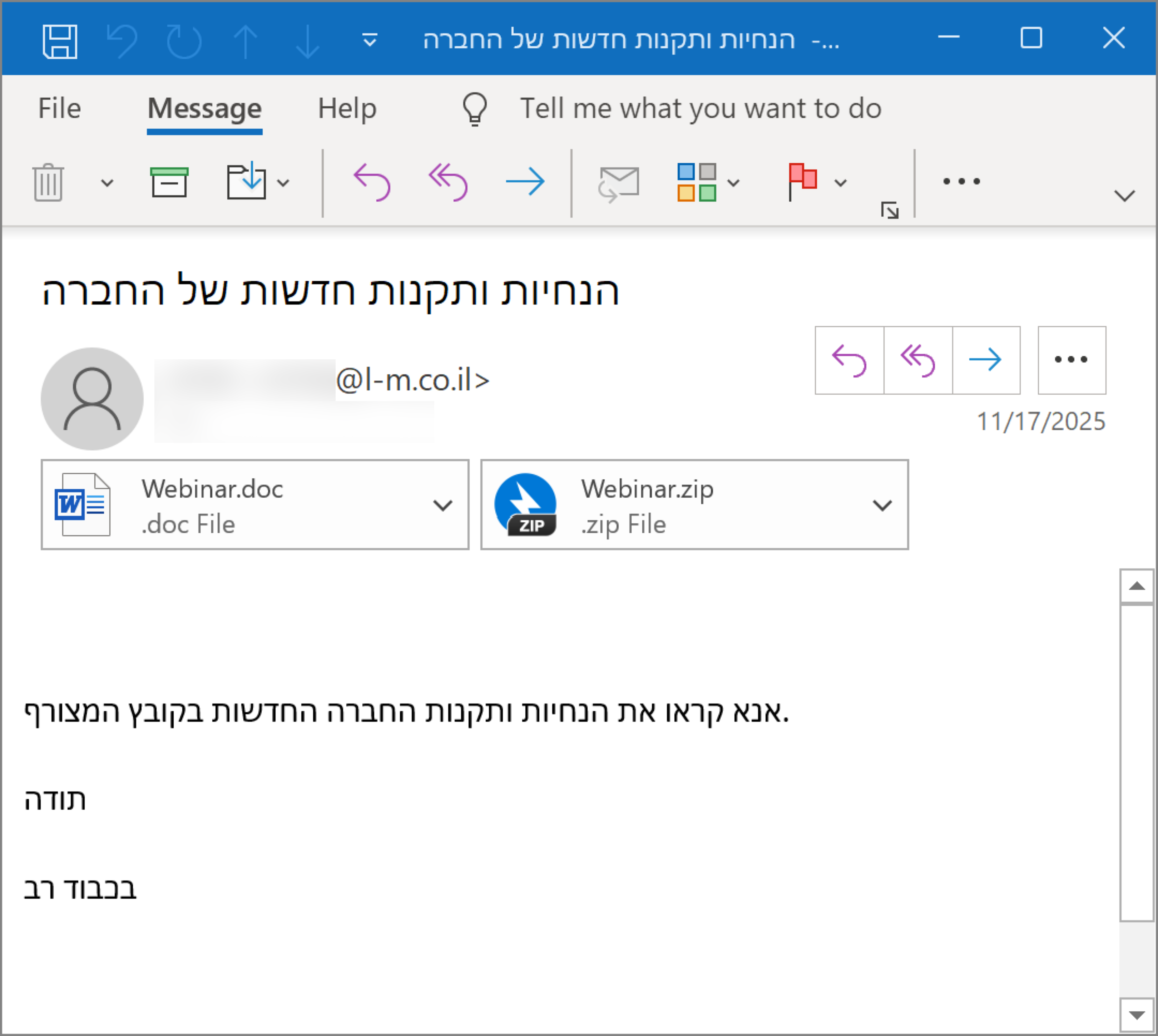 In April 2024, a malicious file distribution attack targeting a university in Israel was identified. A total of 27 university email accounts, believed to belong to faculty and students, were specified as recipients.