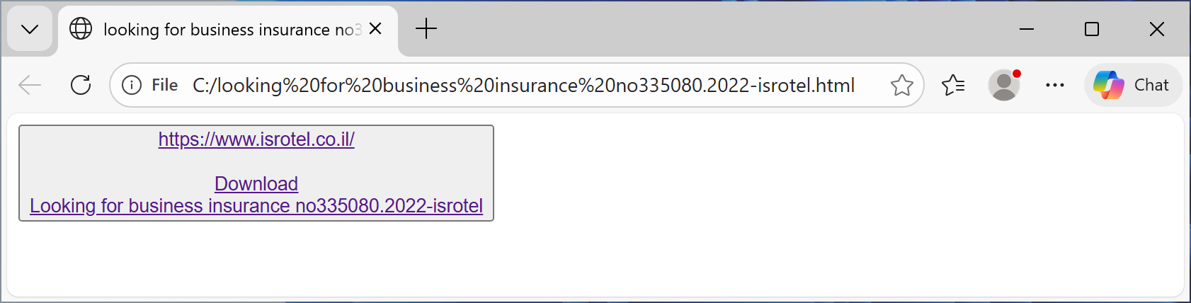 However, this was not a legitimate page. Instead, it led to a link that redirected to OneDrive and ultimately prompted the download of a malicious ZIP archive named "Looking for business insurance no335080.2022-isrotel.zip".