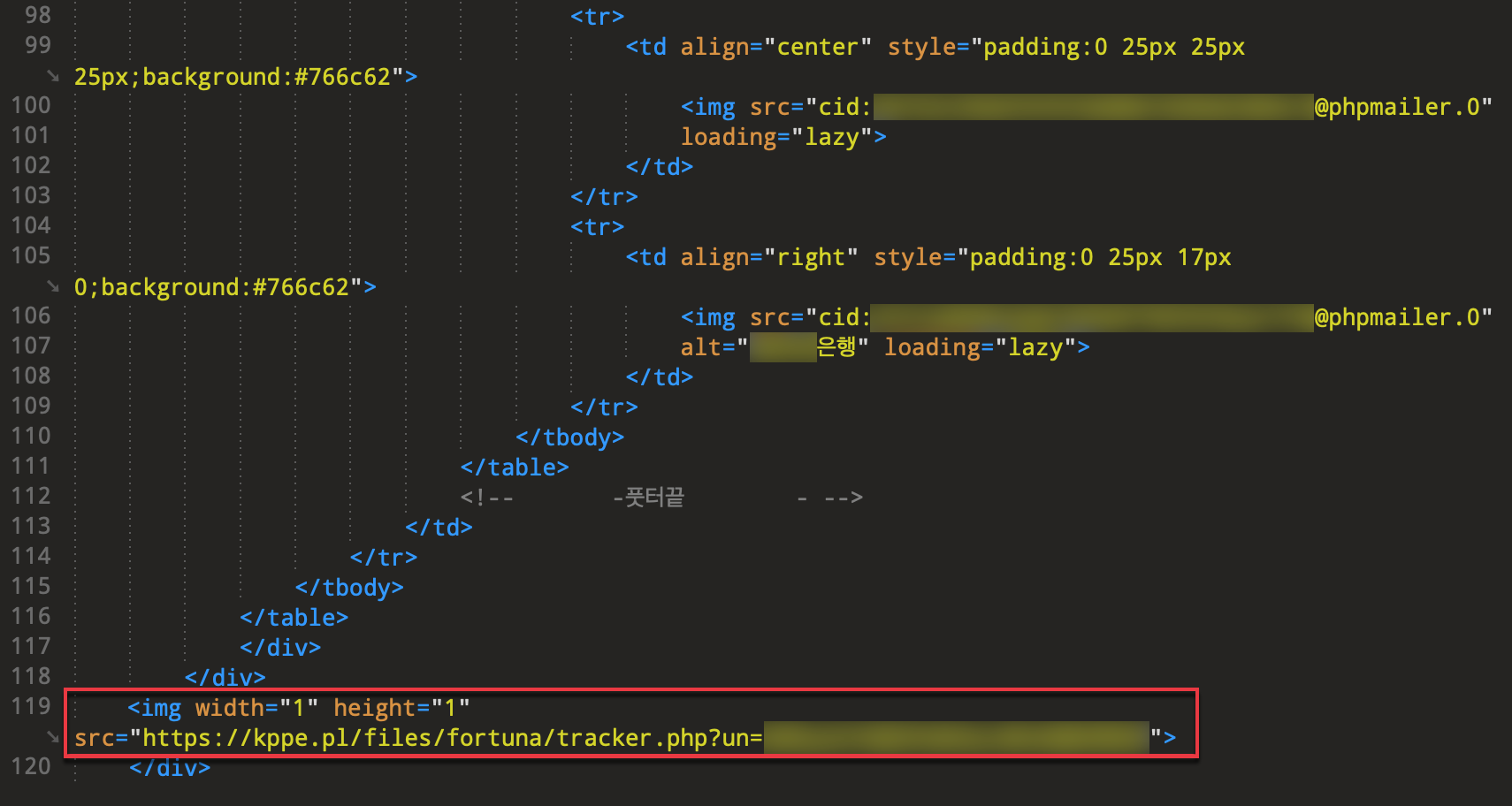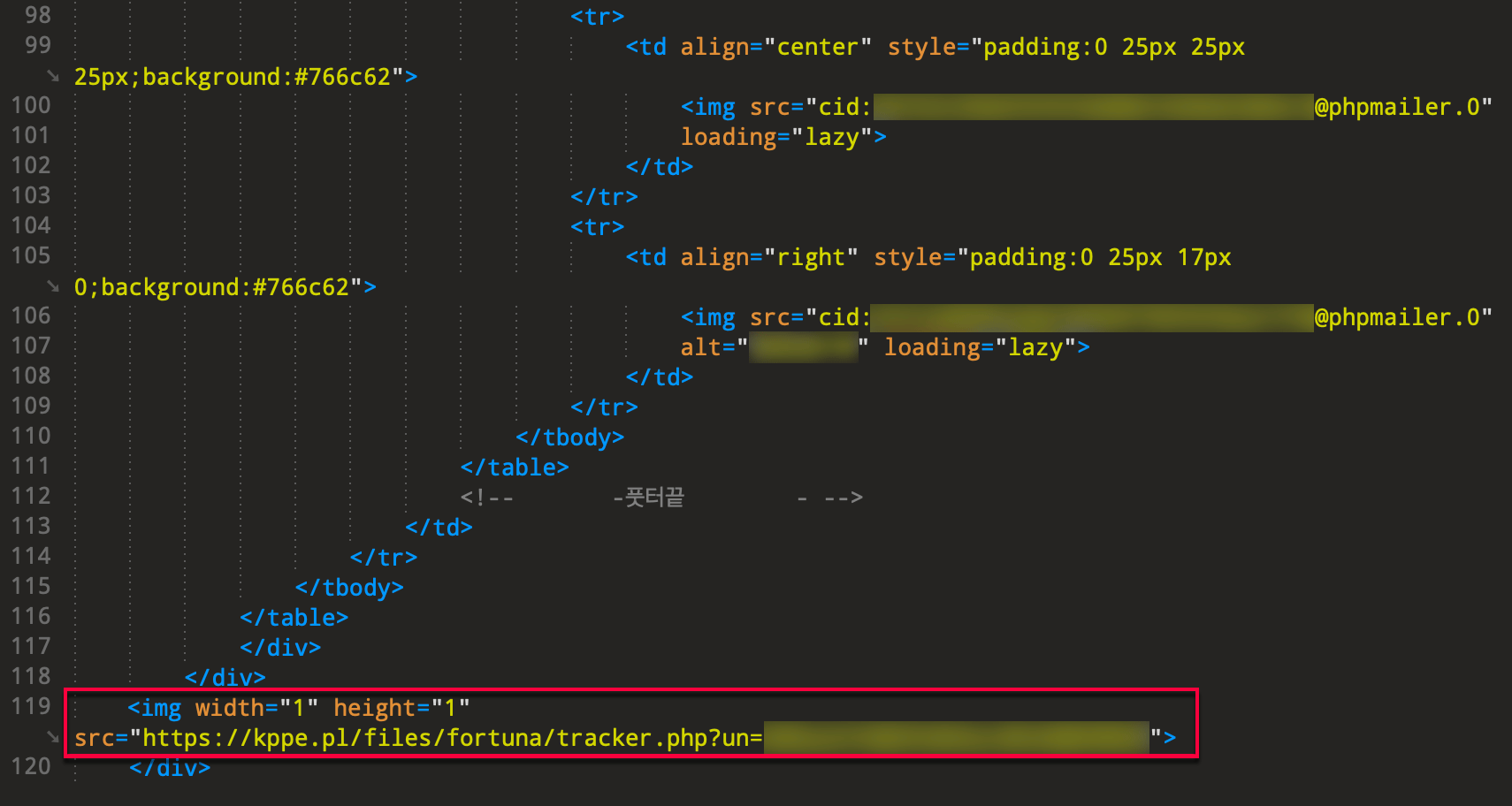 This beacon consists of a transparent 1×1 pixel image. When the email client loads the remote image, an HTTP request is sent to an external server (kppe[.]pl) set up by the threat actor.