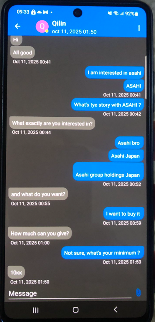 Resecurityによると、Qilinの運営者と非公開で会話を行い、脅威アクターが盗まれたアサヒデータを1,000万ドルで販売しようとしていることが明らかになりました。