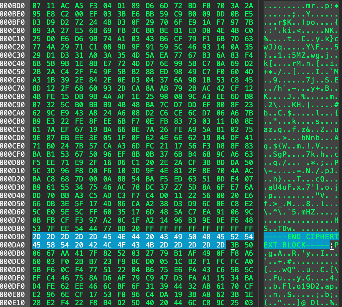 すべての準備が完了すると、ファイル全体のデータを暗号化し、暗号化されたデータ区間の末尾には「-----END CIPHERTEXT BLOCK-----」という文字列が挿入され、区間の境界を明確に示します。また、暗号化されたデータの先頭部分には、最大512バイトまで元のデータの一部が挿入されます。
