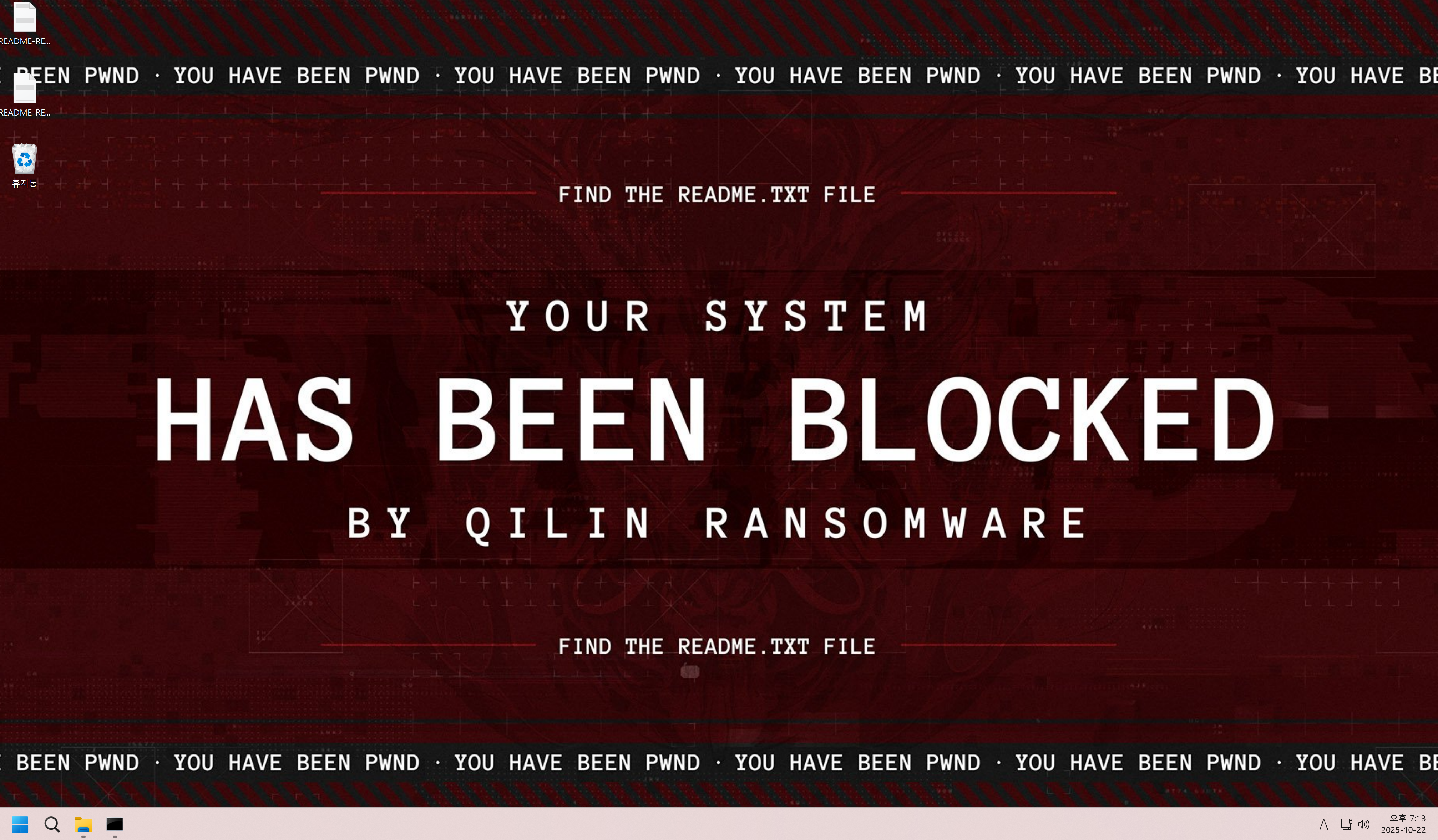 以下の画面はQilinランサムウェアに感染した状態を示しており、デスクトップの背景が攻撃者によって指定された画像に置き換えられていることが確認できます。ランサムウェアはデスクトップの背景変更を通じて、被害者に即座の視覚的認識を促し、復旧要求事項を含むランサムノートの内容を案内し、攻撃者とのコミュニケーションを強要する社会工学的な機能を果たします。