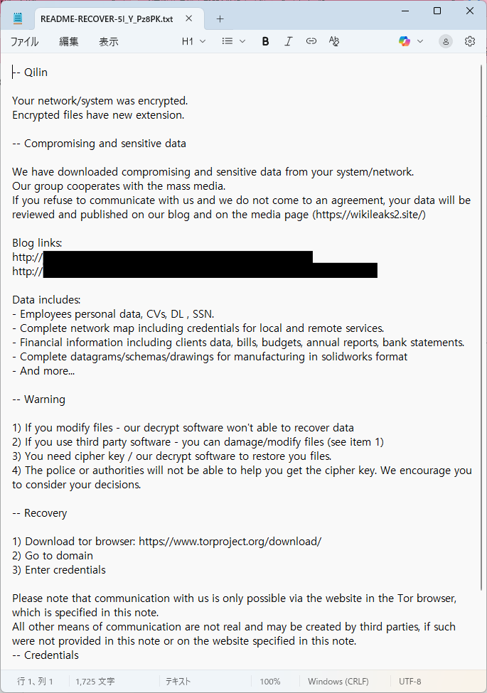 ランサムノート本文には、攻撃者がシステム及びネットワークから機密データを収集し、被害者との交渉が決裂した場合、該当資料を攻撃者が運営するダークウェブに公開するという脅迫文が含まれます。被害者はランサムノートに記載された識別子とパスワードを利用してDLSにアクセスするよう指示され、この過程は単純なファイル暗号化通知にとどまらず、データ流出を前提とした二重脅迫(double extortion)の脅威を伴います。